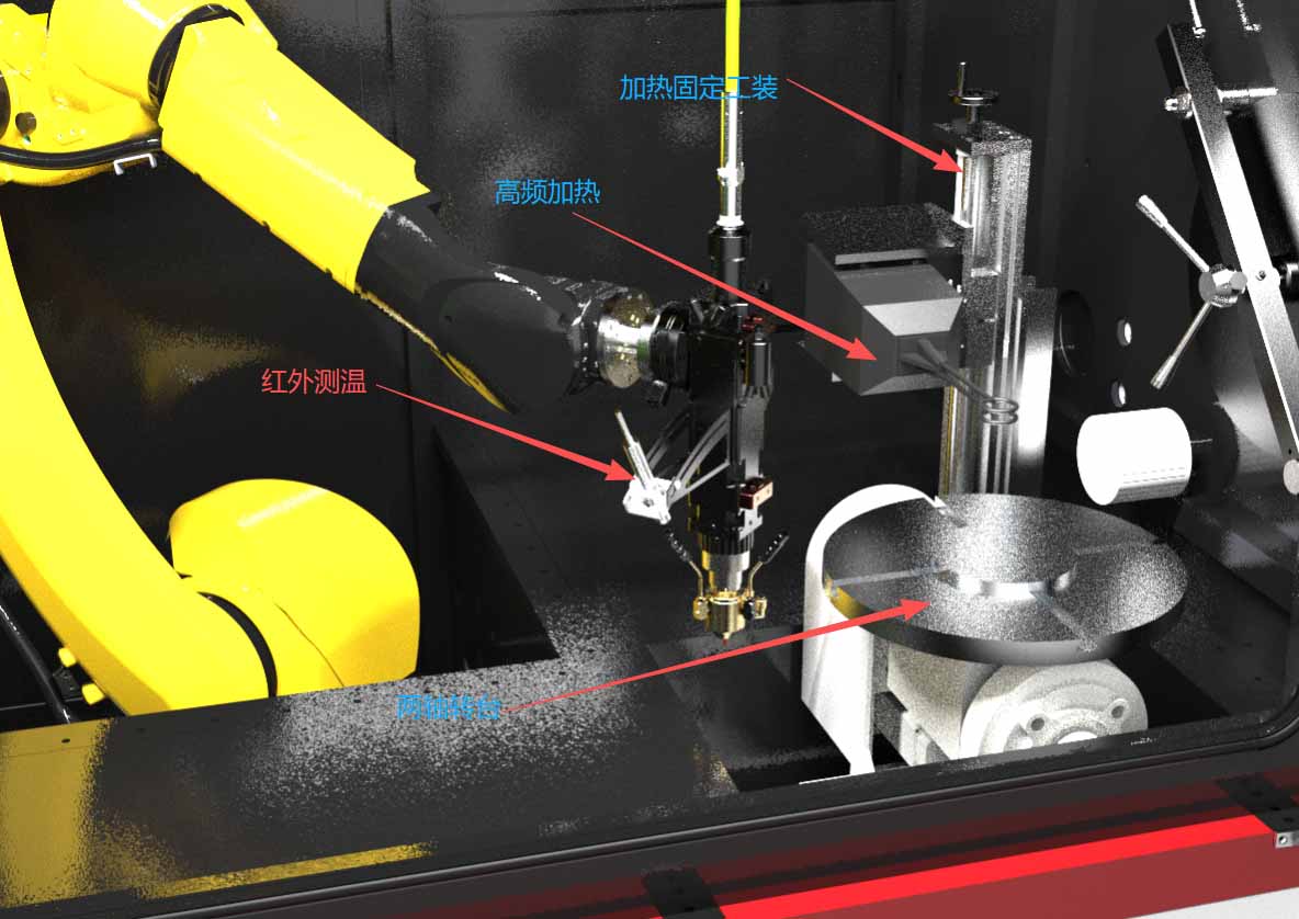 解决方案:依托同轴视觉定位功能,即便在环境箱内操作、人员难以就近进行校点操作的情况下,它也能实时呈现工业机器人的坐标位置,精准显示用于定位的坐标数值,工业六轴机器人与两轴转台组合实现八轴联动,可高效完成叶轮等具有复杂曲面工件的修复与直接成型工作。