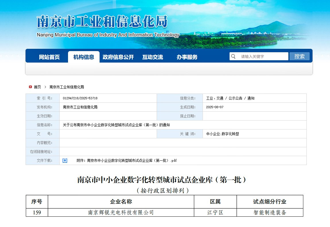 近日,南京市工业和信息化局正式公布了《南京市中小企业数字化转型城市试点企业库(第一批)》的通知,辉锐凭借在智能制造装备领域的硬核实力与创新实践,从众多企业中脱颖而出,成功入选!这一荣誉不仅是对辉锐数字化转型成果的权威认可,更标志着其在激光增材制造细分领域的创新价值获得“官方盖章”——在产品研发、智能化生产、数据驱动运营等核心环节已形成可复制、可推广的“辉锐经验”,为行业树立数字化转型新标杆!