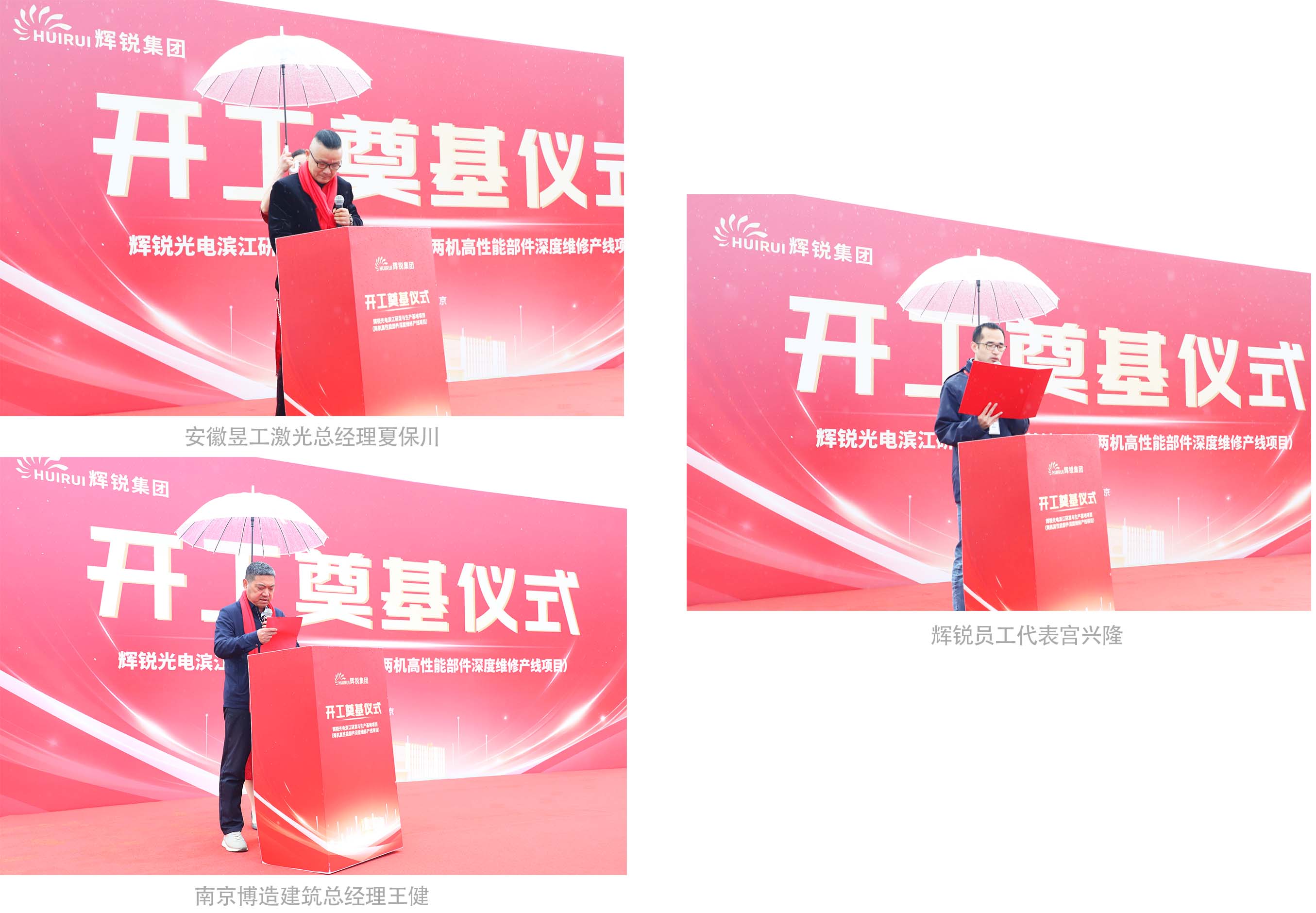 紧接着,合作客户代表、项目建设公司、辉锐员工代表分别受邀上台致辞。合作客户代表安徽昱工激光技术有限公司总经理夏保川对辉锐过硬的技术实力、贴心的周到服务表示高度认可,期待新基地项目建成后双方合作迈向更深层次、更宽广的合作领域。项目建设单位南京博造建筑工程有限公司总经理承诺将以严谨态度、精湛技术高效推进项目建设,为辉锐发展夯实根基。辉锐员工代表宫兴隆用质朴话语回顾了辉锐技术团队齐心协力、潜心钻研、攻坚克难的过往瞬间,表达了紧跟辉锐发展步伐、实现公司与个人职业发展的双向奔赴的决心。