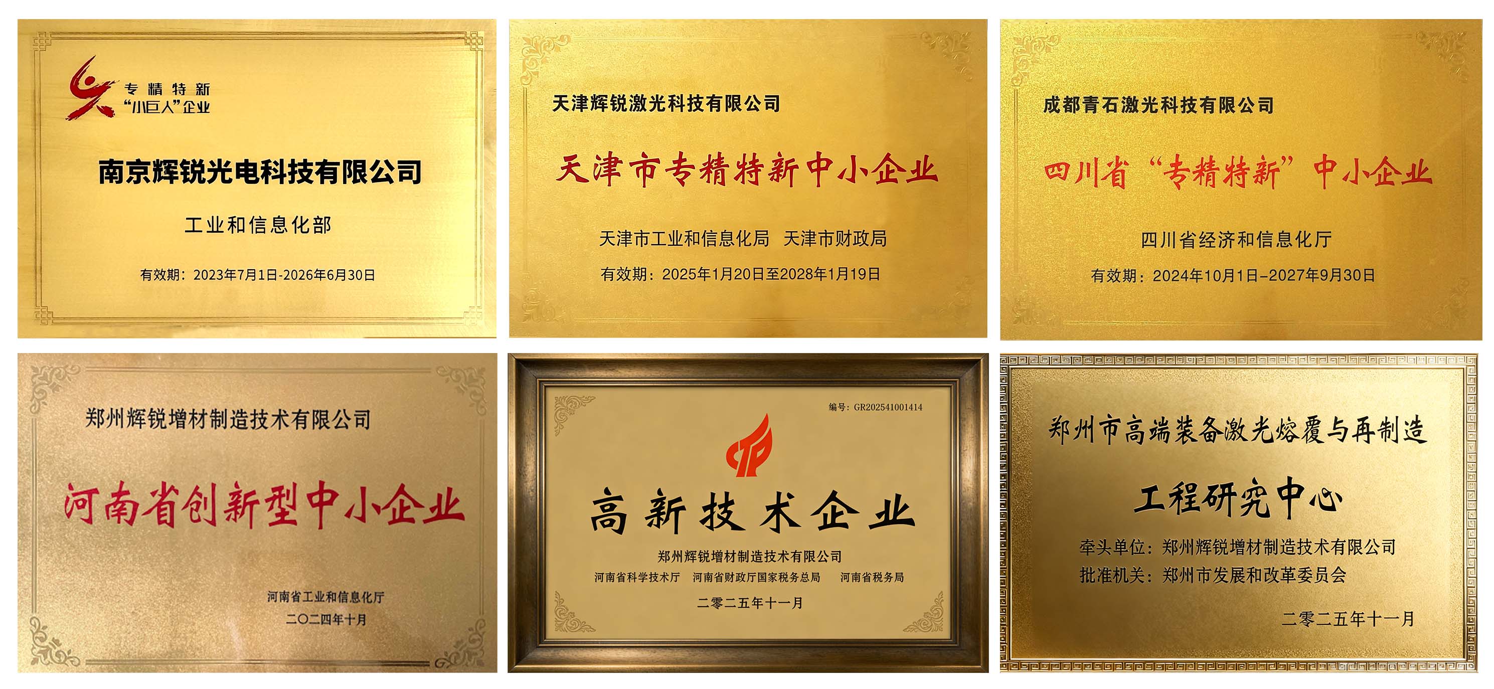 南京辉锐荣获“2025年度中国机械工业科技进步奖”一等奖,该奖是国内机械行业中唯一由国家批准的奖项;天津辉锐、成都青石荣获省级“专精特新”企业认定;郑州辉锐获评“国家高新技术企业”“河南省创新型企业”,牵头组建“郑州市高端装备激光熔覆与再制造工程研究中心”,这是对它们在专业领域深耕细作、精益求精的高度认可。这一系列荣誉的背后,是每一位辉锐人夜以继日的辛勤付出,是团队协作、拼搏进取精神的生动体现。