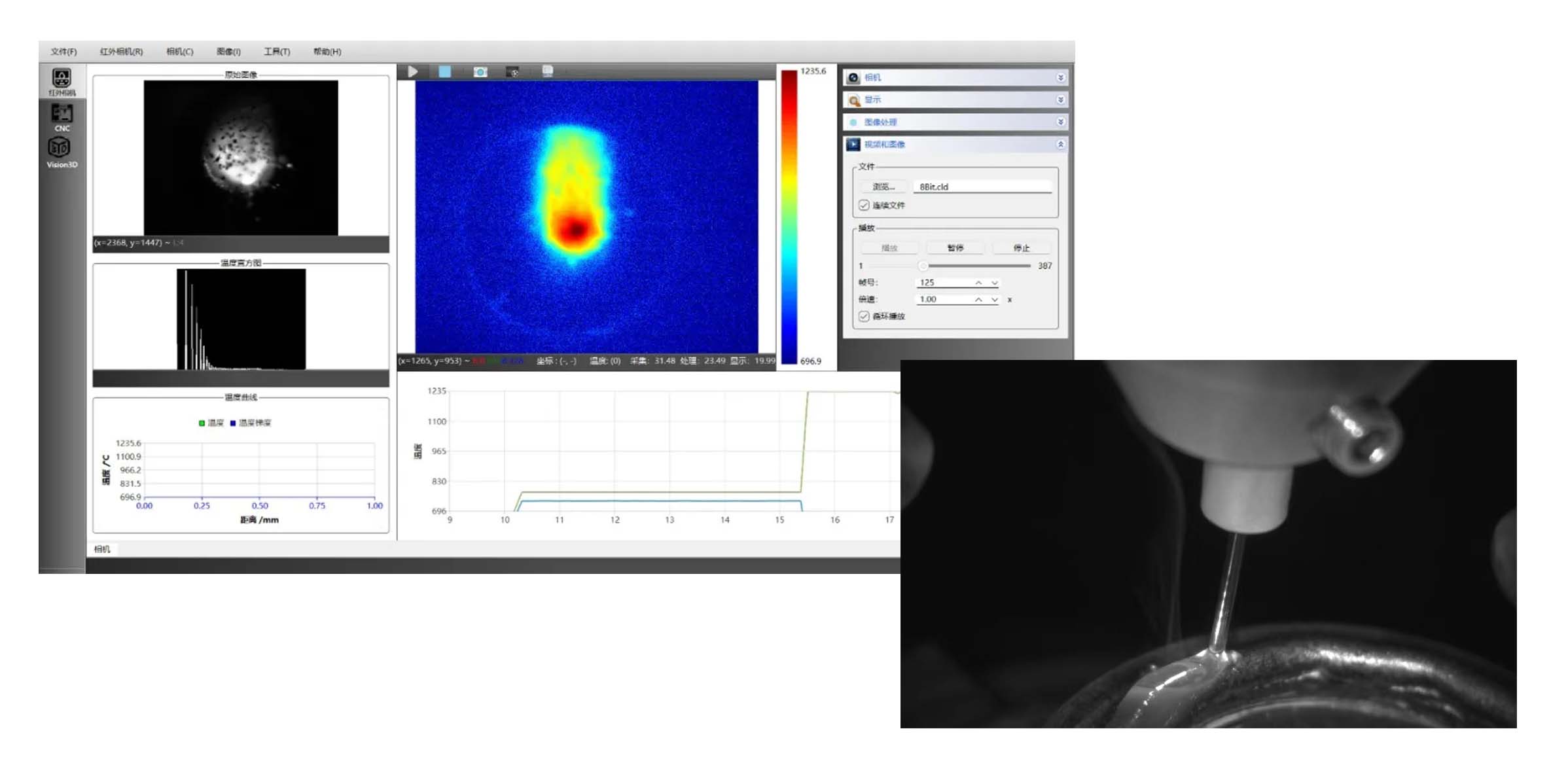 在软件开发领域,辉锐研发团队凭借深厚的技术积淀与不懈探索,成功研发了一款基于红外相机的激光熔覆温度场监测产品。该产品可对熔池及热影响区的温度展开实时、精准的获取与深度分析,进而高效完成温度分布、温度梯度以及凝固速度的在线计算。该功能为熔覆工艺参数优化、组织性能控制和质量稳定性提升提供了重要的数据支撑和技术手段。同时,在强弧光和高亮背景条件下,其成像质量明显优于可见光相机。